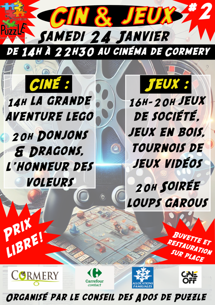 Pour son premier grand projet le conseil des ados de Puzzle vous invite au festival Cin&Jeux, un festival ludique et culturel pour tous les amateurs de cinéma et de jeux !