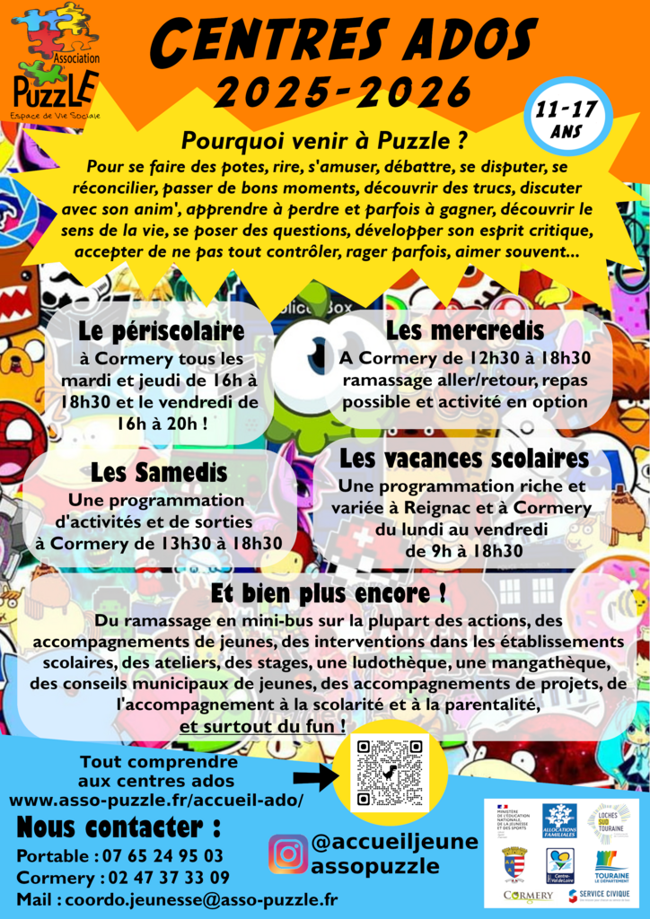 Vous trouverez toutes les informations sur notre fonctionnement en suivant ce lien : https://www.asso-puzzle.fr/accueil-ado/ . Si vous avez encore des questions n’hésitez pas à nous appeler au 07 65 24 95 03 ou au 02 47 37 33 09 nous serons ravis d’échanger avec vous.